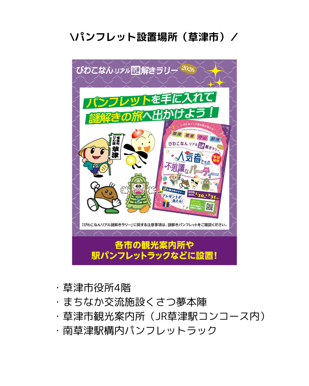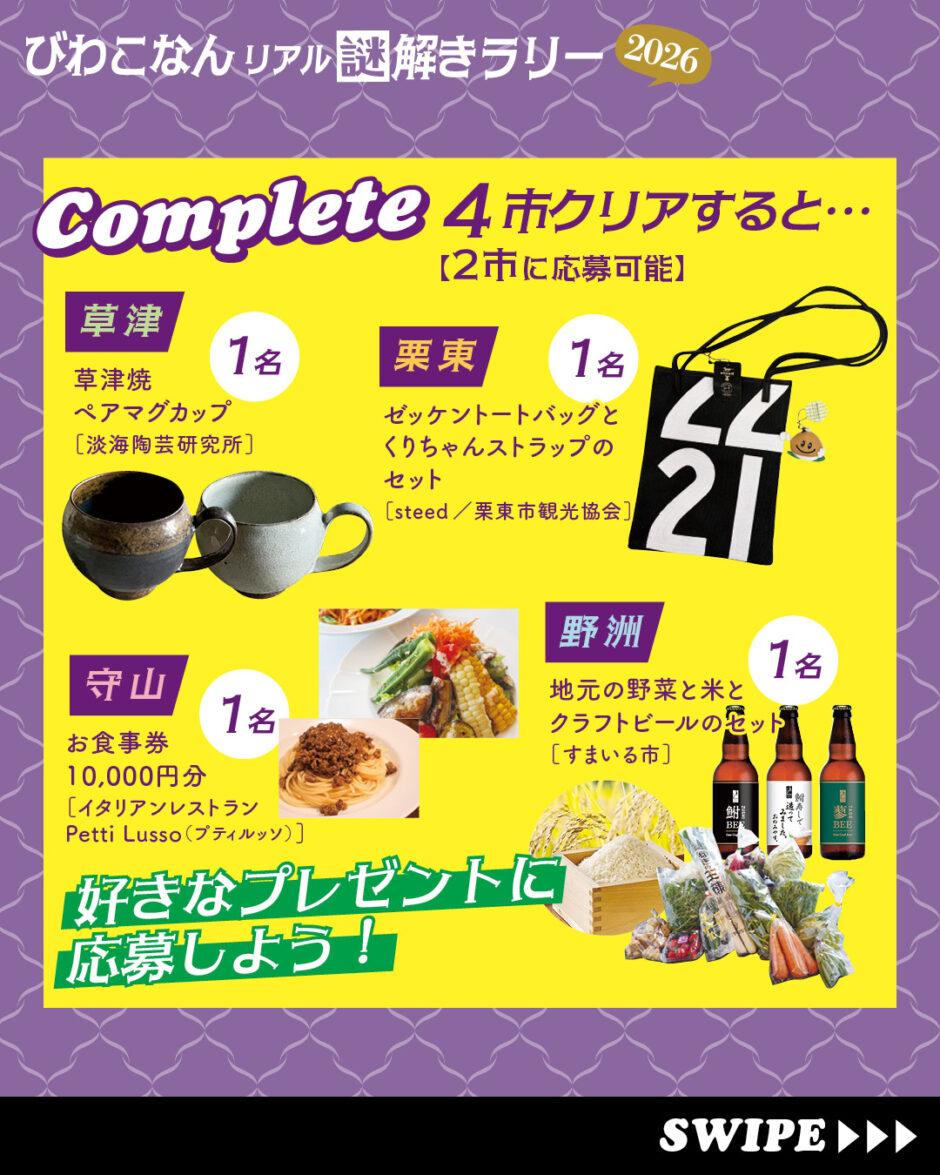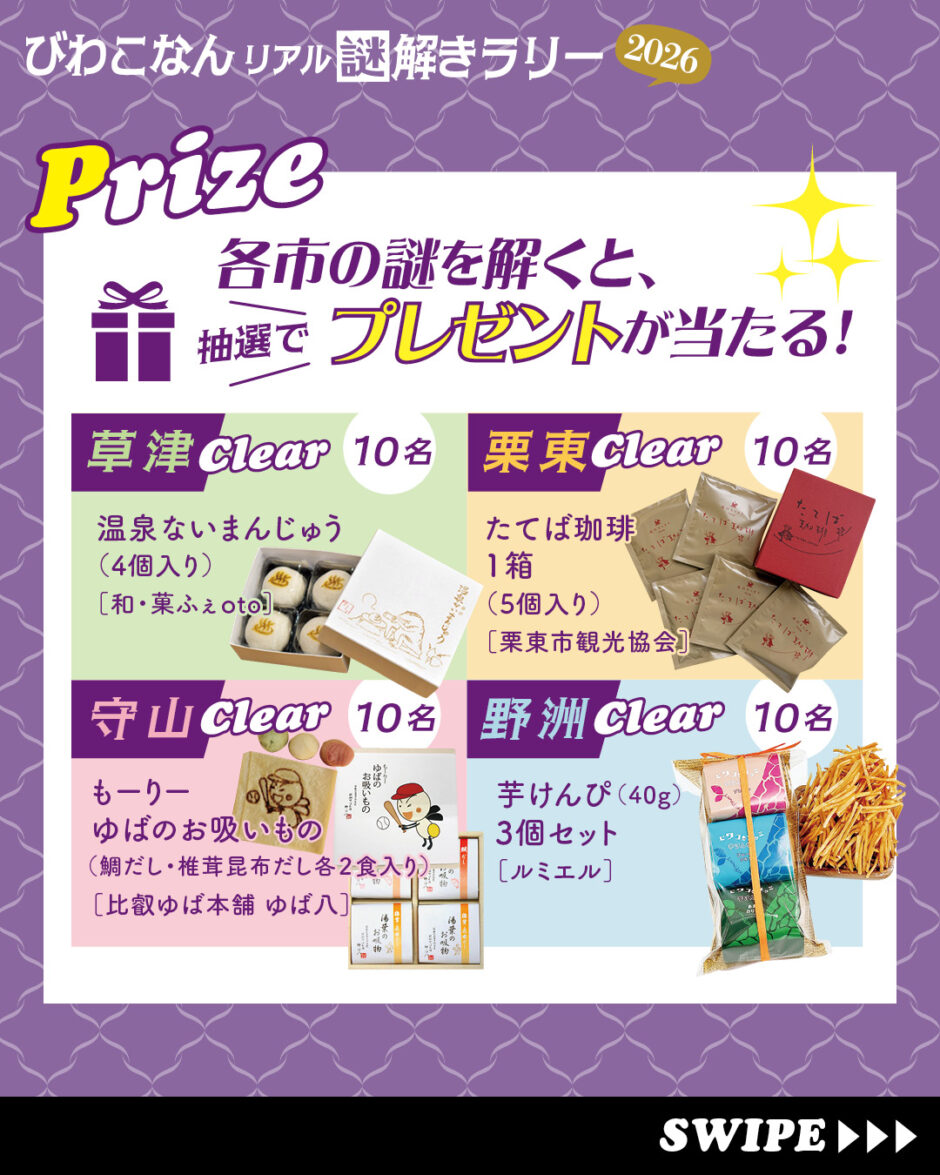 2026年1月10日(土)~2026年3月31日(火)の期間限定で、「草津・栗東・守山・野洲 びわこなんリアル謎解きラリー」を開催いたします。