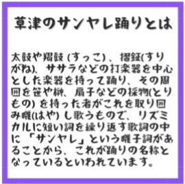 5月3日はユネスコ無形文化遺産に登録された「草津のサンヤレ踊り」のひとつ志那のサンヤレ踊りを解説付きで見学!